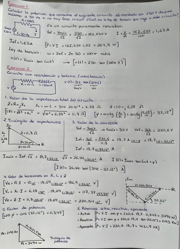 Ejercicio circuito puramente resistivo. Ejercicio circuito con resistencia y bobina (cálculo de impedancia, corriente, tensión en R,L,Z, factor de potencia, potencias activa, reactiva y aparente, y triángulos de impedancias, tensiones y potencias).