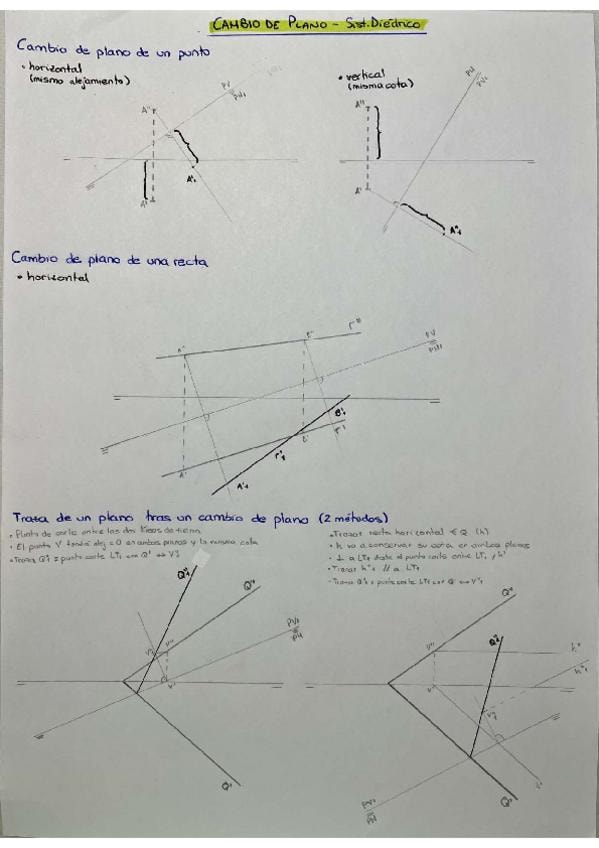 Cambio de plano de un punto y de una recta. Encontrar la traza de un plano tras un cambio de plano. Convertir un plano oblicuo en plano proyectante. Intersección de una pirámide con un plano oblicuo mediante cambio de plano.