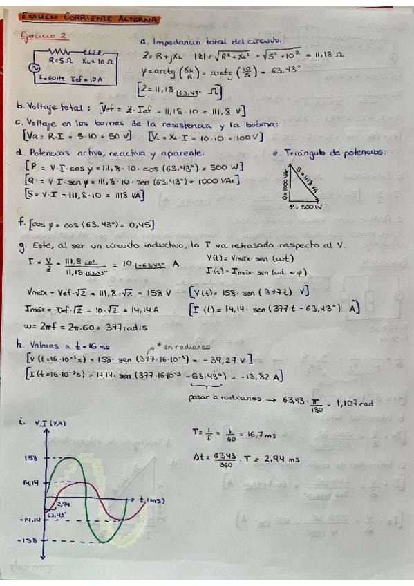 Examen resuelto con ejercicios: Serie RL; impedancia, voltajes, potencias, factor de potencia, gráfica tensión y corriente. Circuito serie RLC con elementos en paralelo; impedancia, intensidad y desfase. Circuito de impedancias en paralelo; impedancia equ