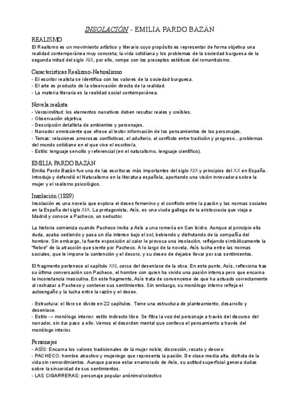 Realismo y características. Emilia pardo Bazán, contexto de la obra "Insolación" (1889) y análisis del fragmento, estructura, estilo y personajes.