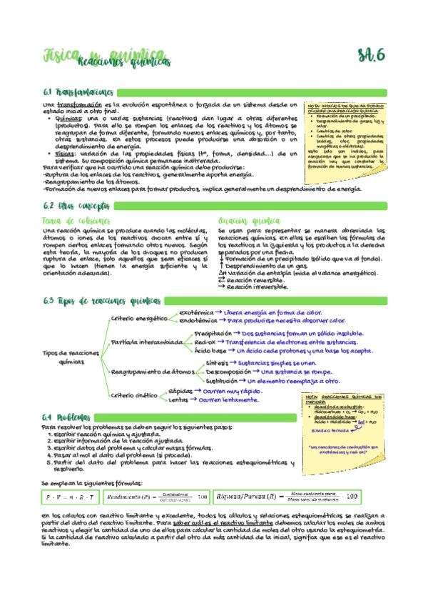Apuntes para examen (nivel 1º de bachillerato) sobre las reacciones químicas. Incluyen: transformaciones químicas y físicas, tipos de reacciones químicas, guía sobre cómo resolver problemas con ecuaciones químicas.