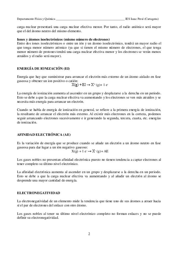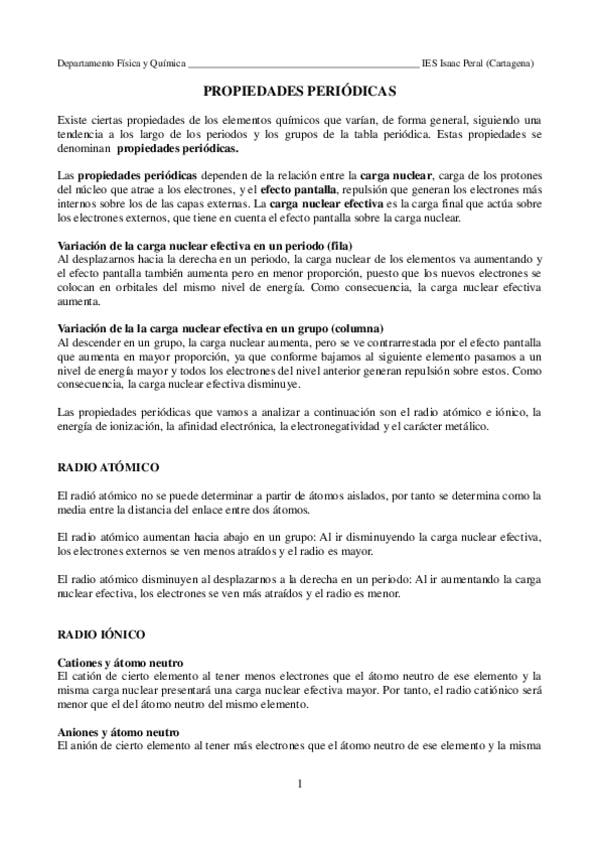 Apuntes de propiedades periódicas explicados de forma clara y directa. Incluye radio atómico, energía de ionización, afinidad electrónica, electronegatividad y carácter metálico, con sus tendencias en la tabla periódica. Ideal para entender y resolver ej