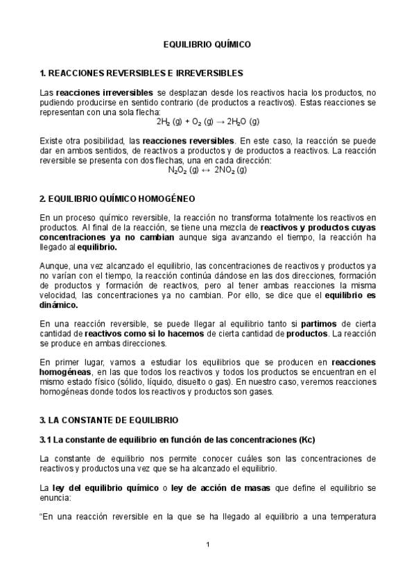Apuntes completos de equilibrio químico: Kc, Kp, cociente de reacción (Q) y principio de Le Chatelier. Incluye método paso a paso para problemas y grado de disociación. Perfecto para dominar ejercicios tipo EBAU y entender el equilibrio de verdad.