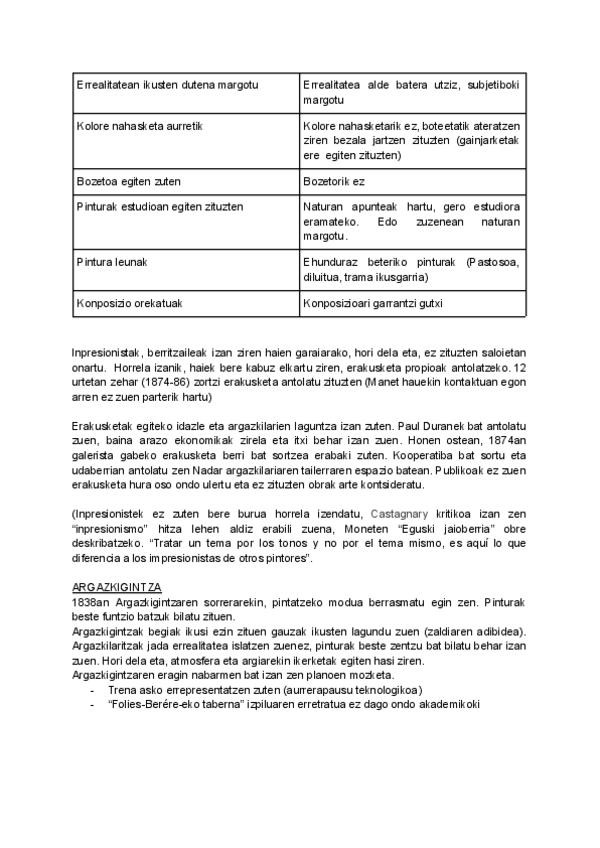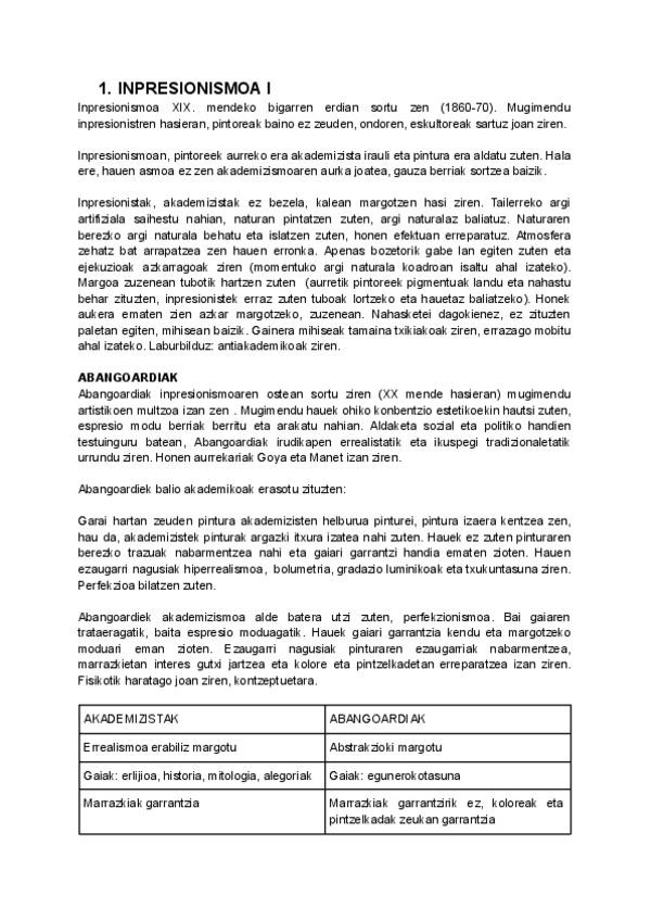 INPRESIONISMOA, POSTINPRESIONISMOA, SINBOLISMOA, KUBISMOA, FUTURISMOA, ESPRESIONISMOA ETA ABSTRAKZIOA
