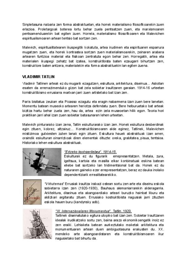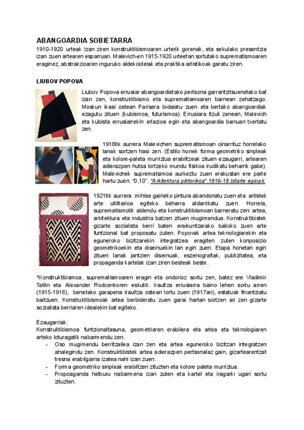 ABANGOARDIA SOBIETARRA, DADISMOA, KONSTRUKTIBISMOA, SURREALISMOA, PICASSO, EXPRESIONISMO ABSTRAKTUA, ARTEA EUSKAL HERRIAN