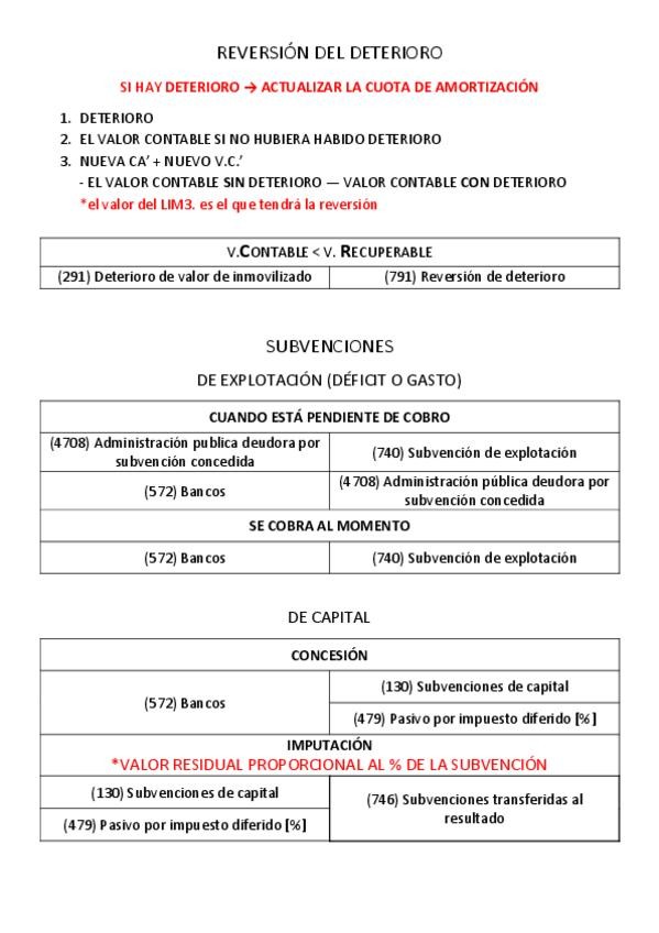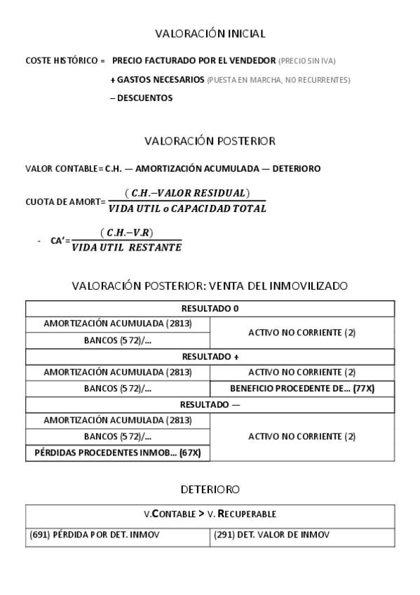 Valoración inicial, valoración posterior, deterioro + reversión, subvenciones, arrendamientos, provisión, inmovilizado en curso, reparaciones