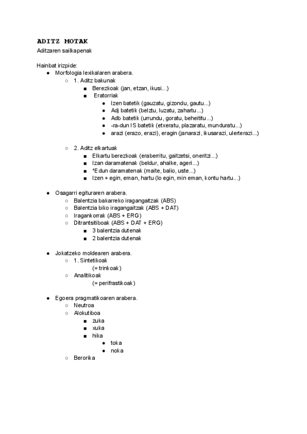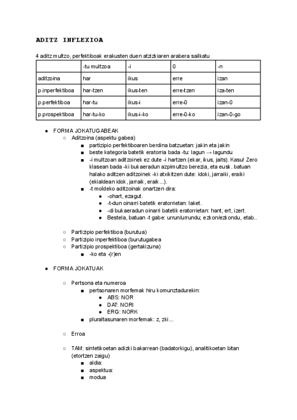 Euskal Ikasketetako lehenengo urteko Euskal Gramatikako 1.partziala. Aditz motak, aditz inflexioa.