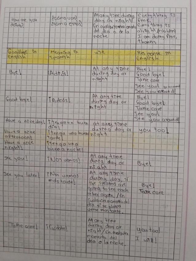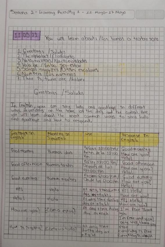 saludos, alfabeto, nacionalidades, verbo ser-estar, útiles escolares, los números, haber.