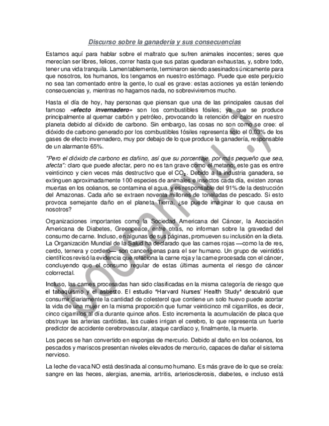 ¡Documento con un discurso que habla acerca de la ganadería y sus consecuencias en el medioambiente en la salud! Esto lo realicé alrededor del 2021, así siéntanse libre de cuestionar todo y complementar la información, pues es posible que muchos de estos