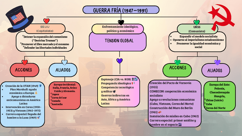 Mapa conceptual sobre la Guerra Fria , con sus hechos mas importantes , ideas principales y un breve cuestionario para practicar .