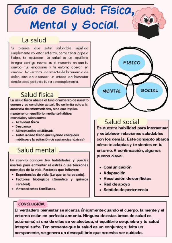 Apunte visual y directo sobre la salud integral. Contiene esquemas claros sobre los factores que influyen en nuestro bienestar. Incluye la explicación de por qué el equilibrio entre lo físico, mental y social es necesario para evitar la enfermedad. Estruc