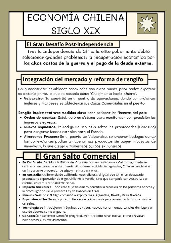 Apunte completo sobre la Economía Chilena en el Siglo XIX. Incluye: -Reformas de Rengifo y el rol de Valparaíso. -Ciclos de exportación: Trigo, Minería y Salitre. -Impacto social: Urbanización, surgimiento de la Clase Media y el Proletariado. -Influencia