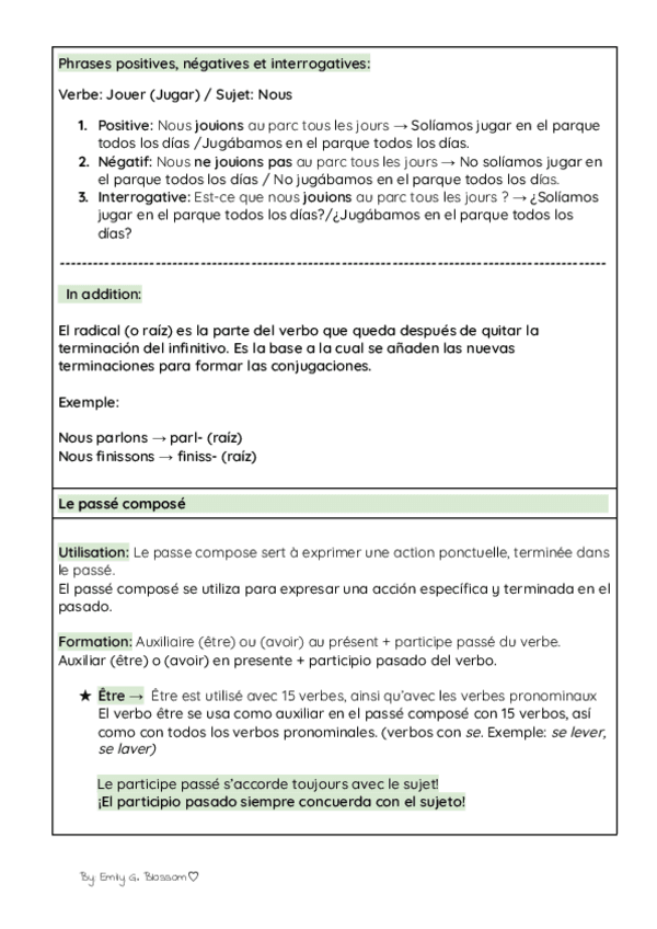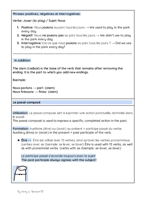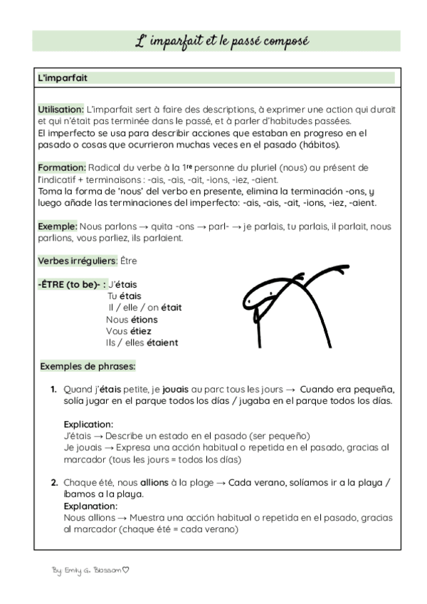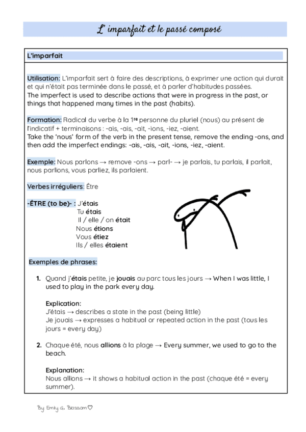 Bilingual notes (French and English) on L’ imparfait and le passé composé. Includes clear explanations, practical examples, and comparisons between verb tenses to make learning easier. Perfect for middle and high school students who want to strengthen the