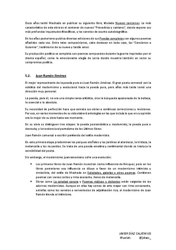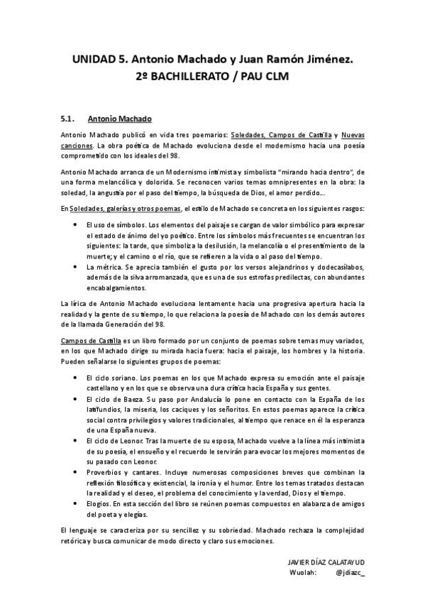 Resumen Antonio Machado y Juan Ramón Jiménez. Lengua castellana y literatura II - UNIDAD 5 PAU CLM