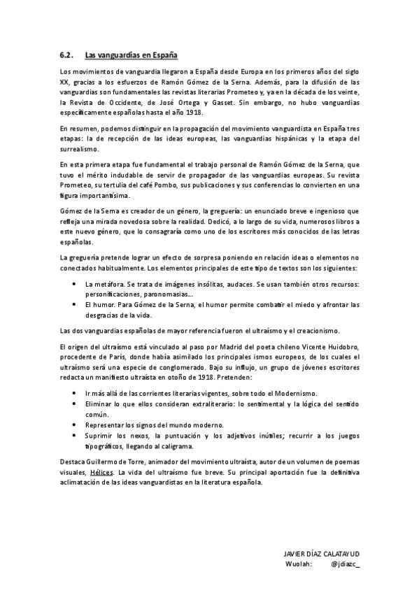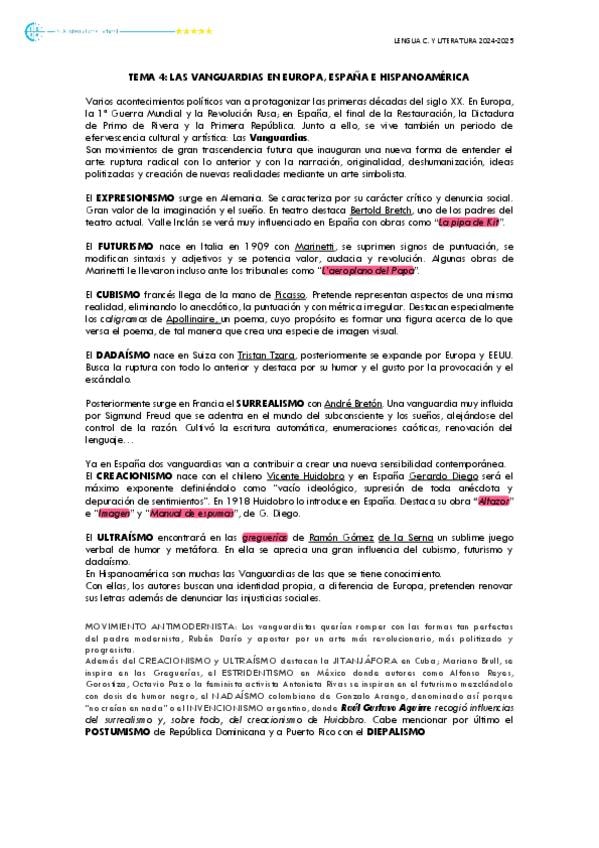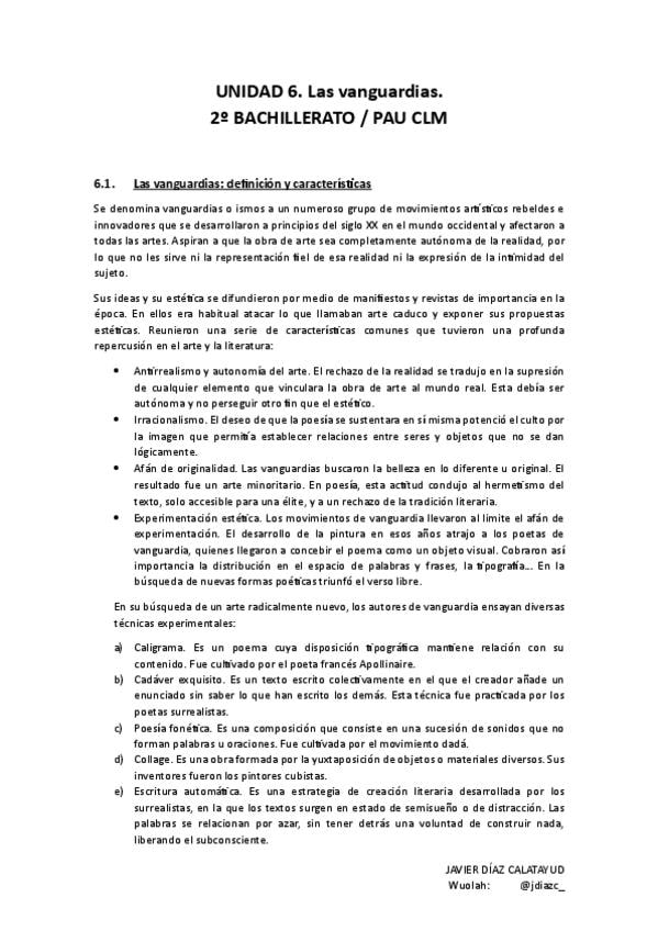 Resumen Las vanguardias. Lengua castellana y literatura II - UNIDAD 6 PAU CLM
