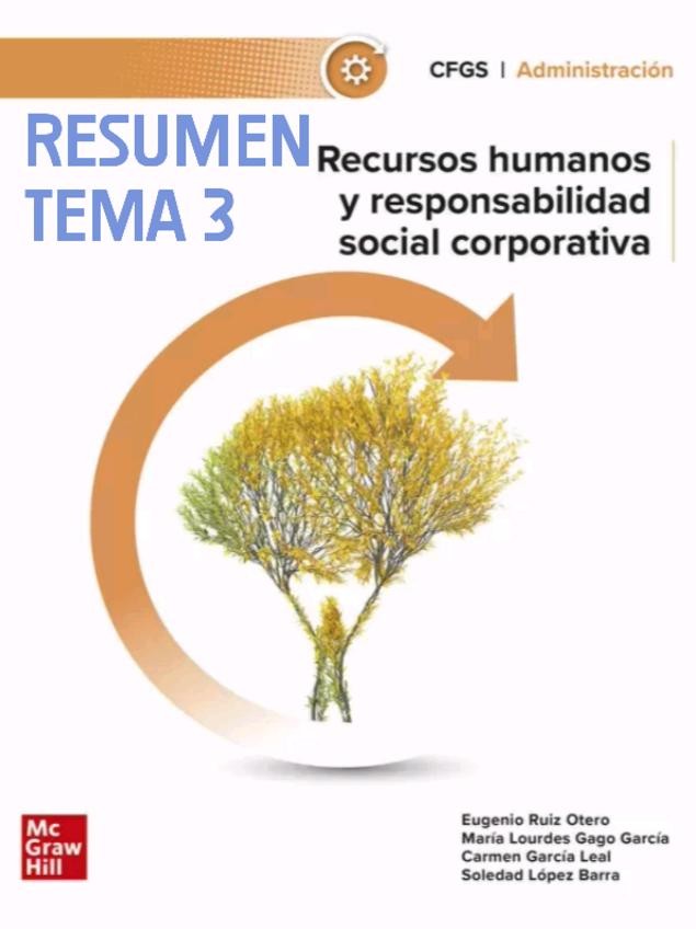 Resume tema 3 de recursos humanos y responsabilidad social corporativa CFS Administración y Finanzas RECURSOS HUMANOS Y RESPONSABILIDAD SOCIAL CORPORATIVA ISBN: 9788448641672