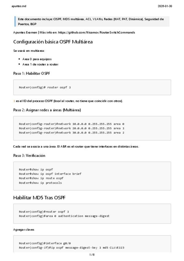 OSPF, MD5 multiárea, ACL, VLANs, Redes (NAT, PAT, Dinámica), Seguridad de Puertos, BGP