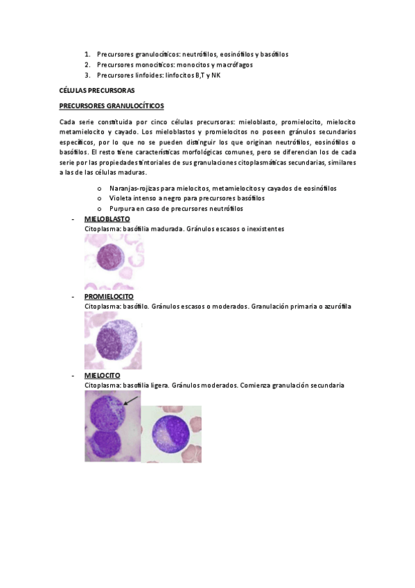 Tablas desde Stem-cell hasta maduración completa, junto a fotos y características de cada estadio. Eritropoyesis, linfopoyesis, granulopoyesis, monopoyesis y trombopoyesis.