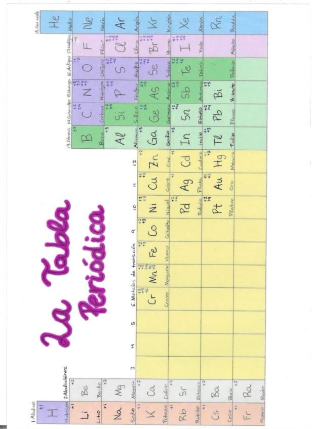 Tabla periódica con valencias hecha a mano de los elementos necesarios para el examen de formulación