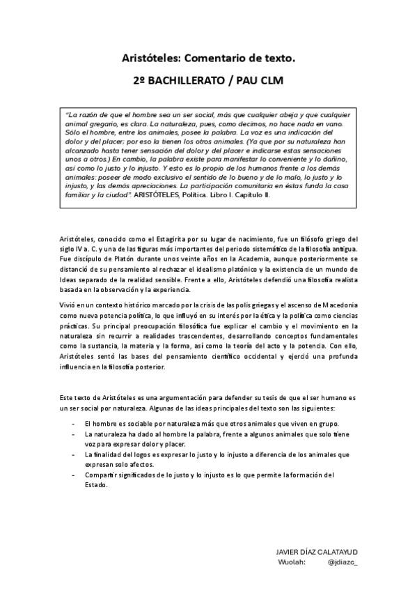 Comentario de texto Aristóteles, Política. Libro I. Capítulo II. Historia de la filosofía 2º Bachillerato - PAU Castilla-La Mancha