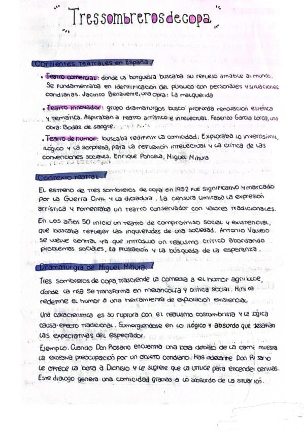 Resumen del libro de Tres sombreros de copa de Miguel Mihura y práctica de este para la Pau.