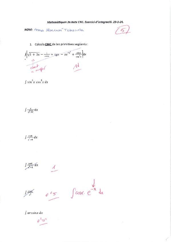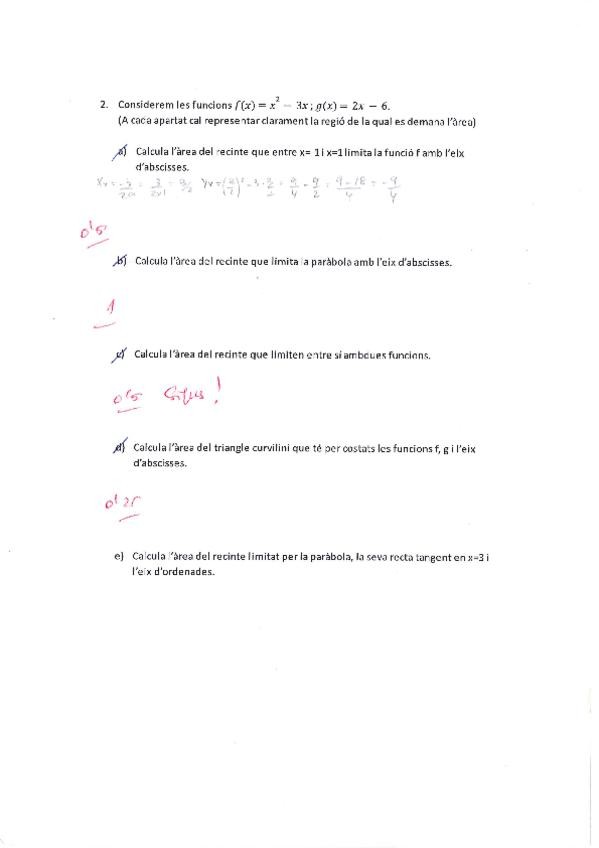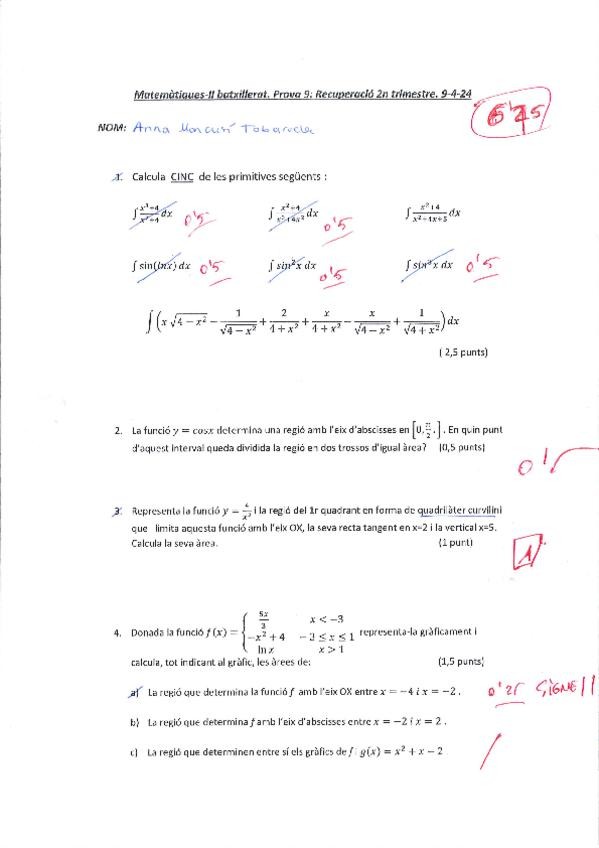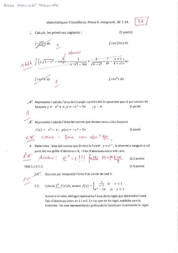 Examen d'integració definida i indefinida de segon de batxillerat fet per mi i corregit pel meu professor.