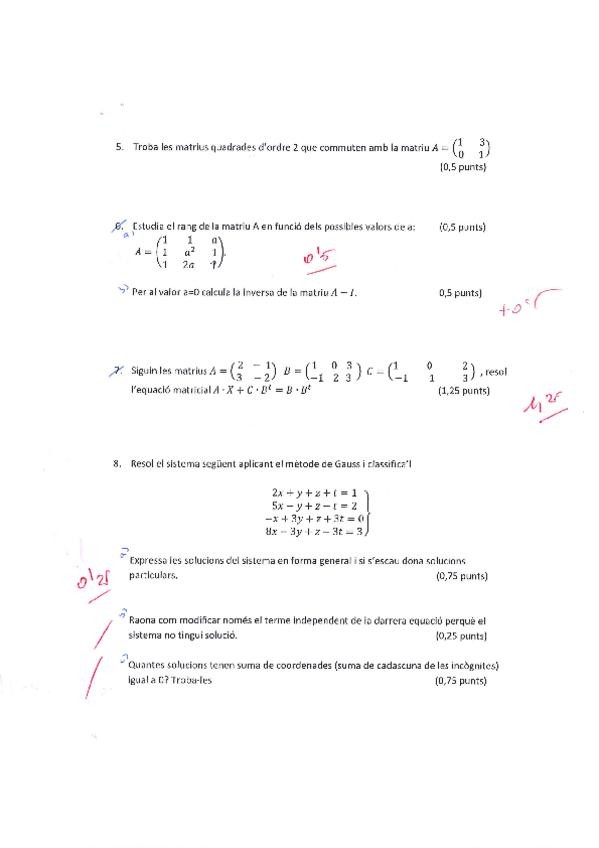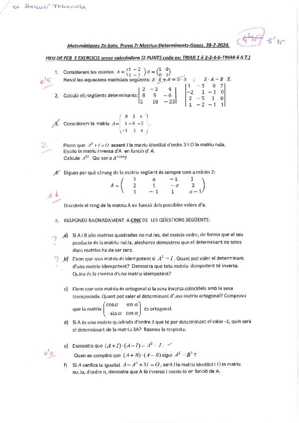 Examen de Matrius, Determinants i Gauss de segon de batxillerat fet per mi i corregit pel meu professor.