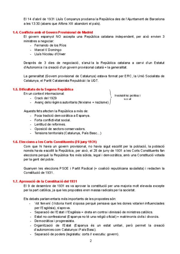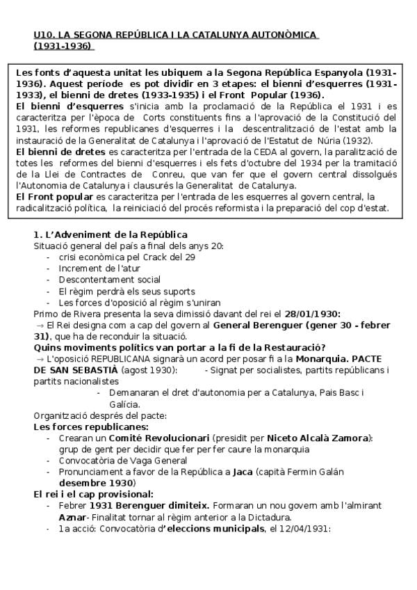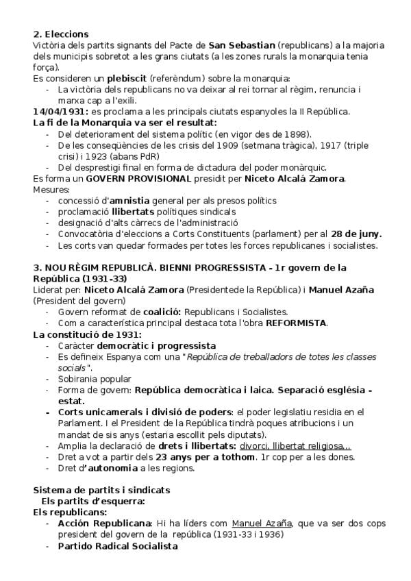 Apunts Història d'Espanya: La segona república i la Catalunya autònoma (1931-1936).