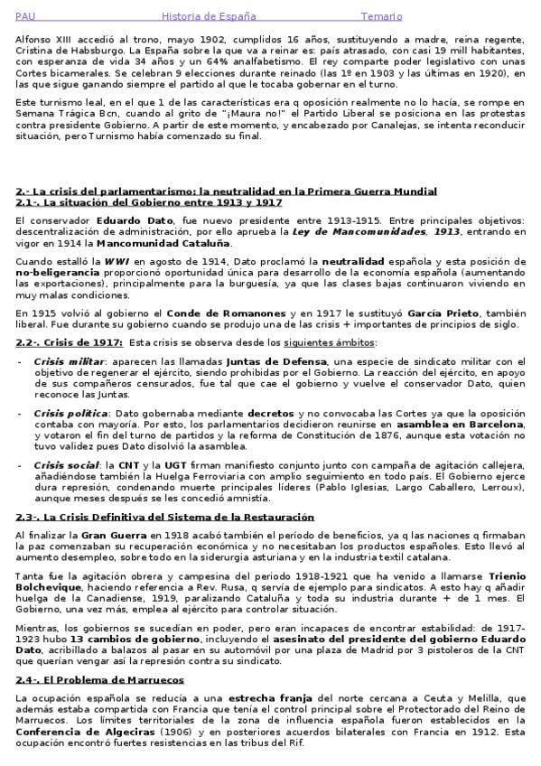 Resumen Tema 5: Alfonso XIII y la crisis de la restauración. Corregido. PAU
