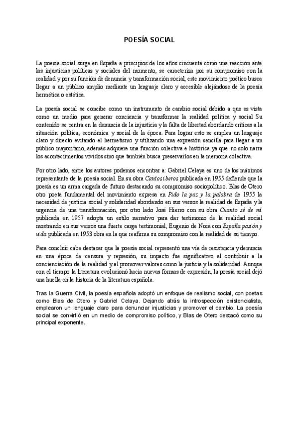 POESIA SOCIAL (LENGUA CASTELLANA Y LITERATURA) Contiene una introducción, resumen y conclusión. Utilizados para la PAU