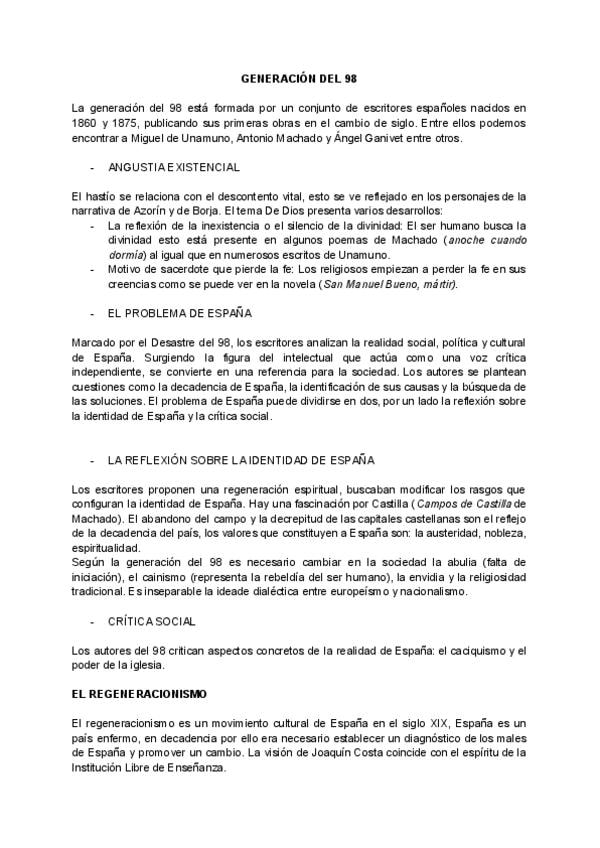 Resumen de la Generación del 98, con introducción y conclusión. Utilizados para la PAU