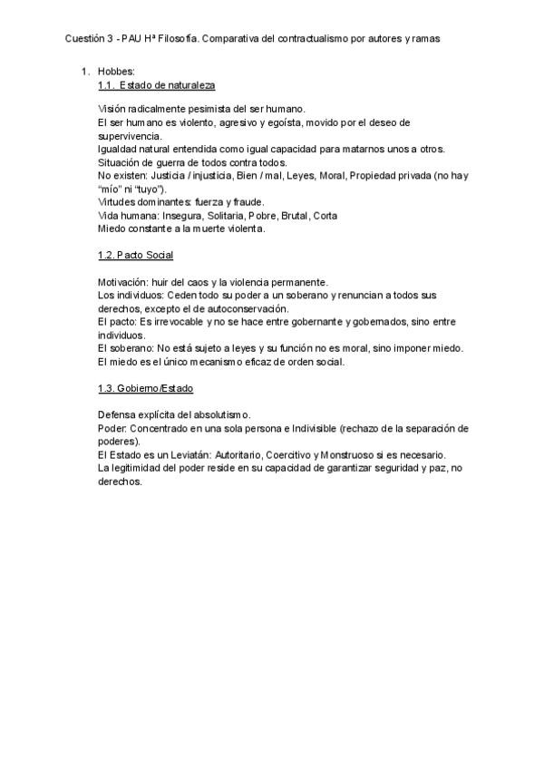 Apuntes del contractualismo dividido por autores y sus ramas (Estado de Naturaleza, Pacto Social y Gobierno/Estado).