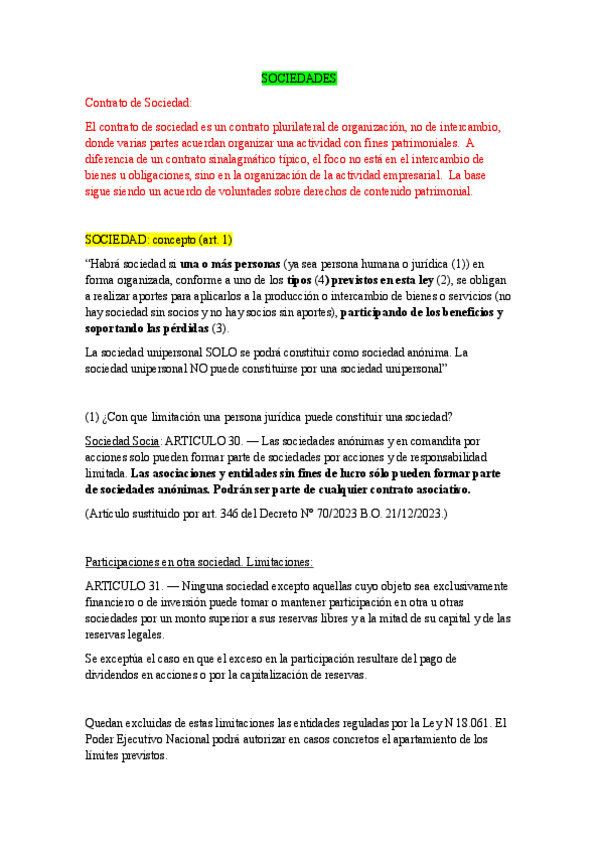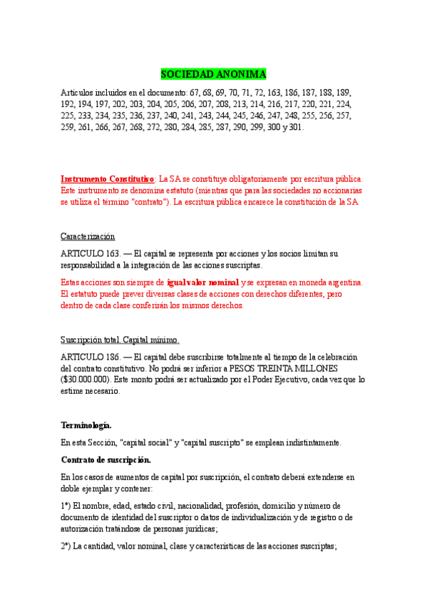 Artículos referentes a SA y SRL (LEY GENERAL DE SOCIEDADES Nº 19.550) con apuntes de clase sobre estas sociedades.