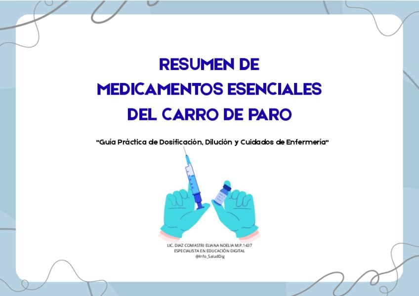 Guía de Medicación: Carro de Paro (Edición 2026) Resumen técnico diseñado por Lic. en Enfermería. Incluye: • Fármacos PCR: Adrenalina, Adenosina y Amiodarona (Dosis adultos/pediatría). • Vasoactivos: Noradrenalina, Dopamina y NTG • Antídotos: Flumazenil