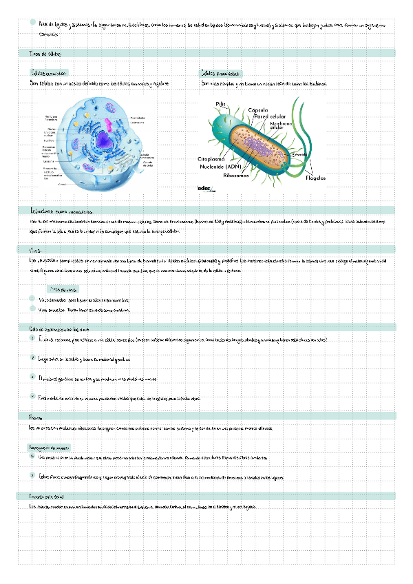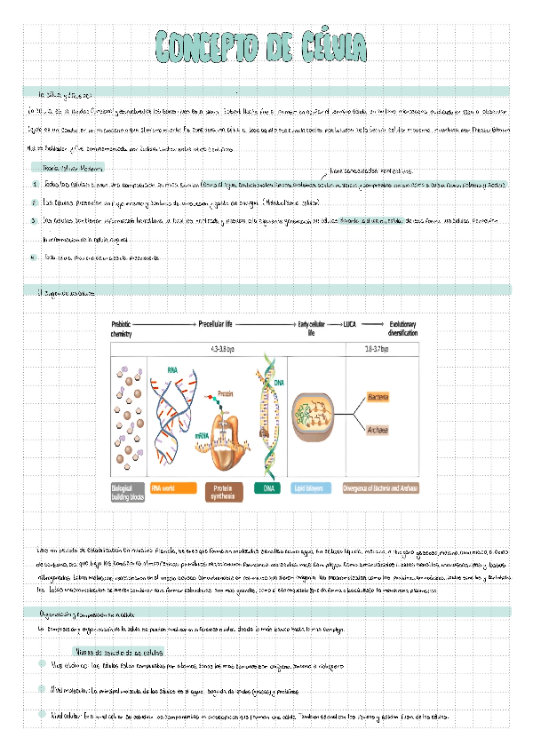 Apunte completo y visual sobre la célula: teoría celular, origen de la vida, niveles de organización, diferencias entre células eucariotas y procariotas, virus y priones. Incluye diagramas y situaciones de análisis para identificar tipos de estructuras bi