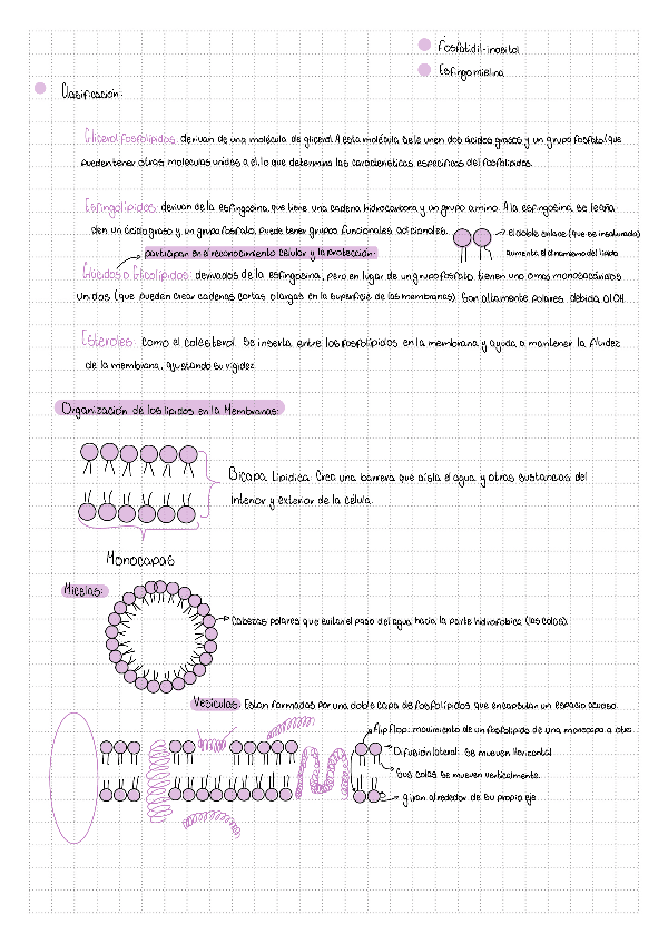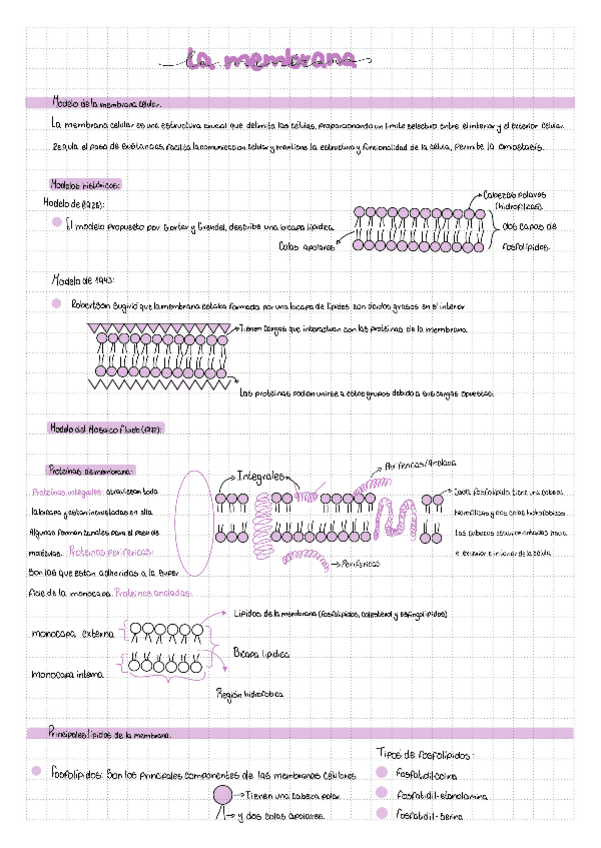 Apunte visual y completo sobre la membrana celular: modelos históricos, bicapa lipídica, tipos de fosfolípidos, colesterol, organización en micelas y vesículas, fluidez, proteínas integrales y periféricas. Explica estructura, dinámica y funciones esencial
