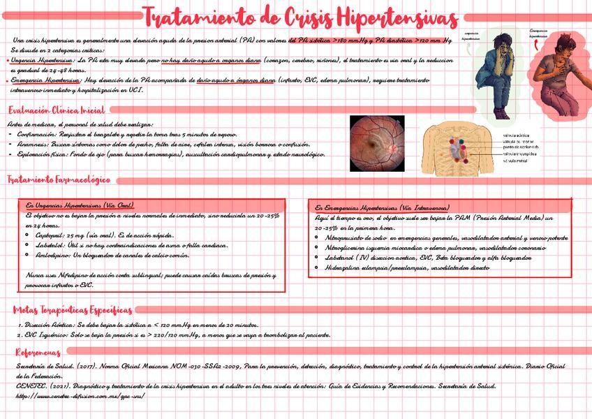 Resumen claro y estructurado sobre el tratamiento de las crisis hipertensivas, útil para estudio clínico y repaso en servicios de urgencias. Incluye: Diferencia entre urgencia y emergencia hipertensiva Objetivos de reducción de presión arterial según el e