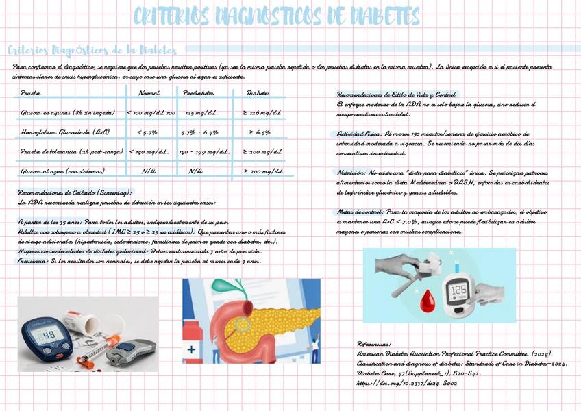 Resumen claro y actualizado sobre los criterios diagnósticos y recomendaciones clínicas en Diabetes Mellitus tipo 2. Incluye: Criterios de diagnóstico (glucosa en ayuno, HbA1c, PTOG, glucosa casual) Metas de control glucémico y seguimiento Cambios en esti