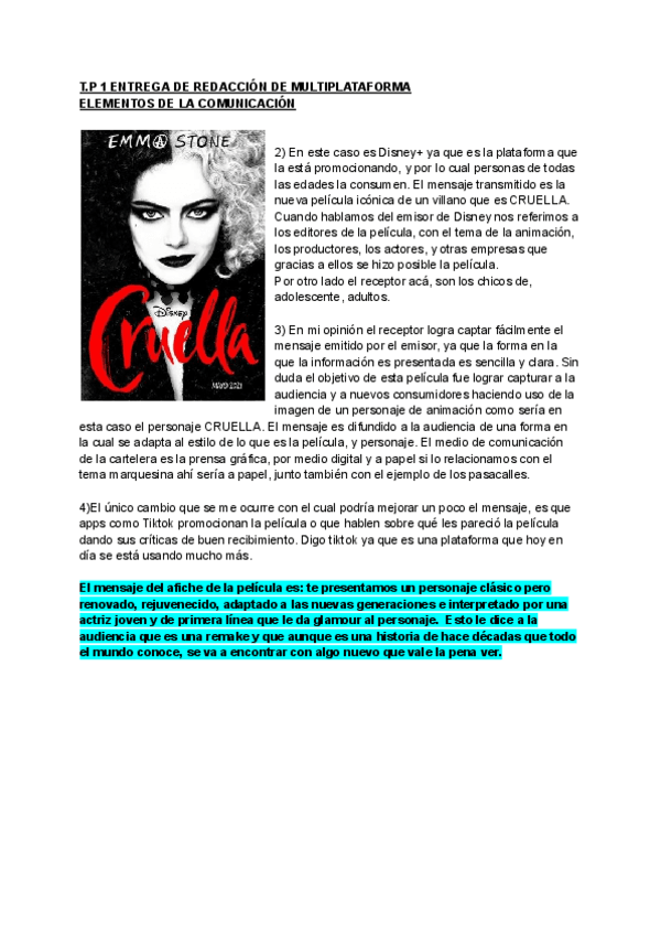 Elegi una pelicula de Disney, "CRUELLA". Me base mucho en la portda de la pelicula para desarrollar lo que es Receptor y Emisor. Para la materia a la cual trabaje es de Redaccion de Multiplataforma.