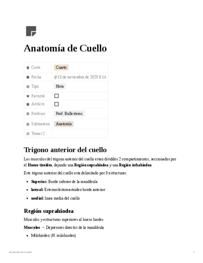Apuntes completos de anatomía del cuello que abarcan el triángulo anterior y posterior, músculos supra e infrahioideos, esternocleidomastoideo, paquete neurovascular del cuello, nervio vago y nervio laríngeo recurrente, arterias carótidas y subclavia, ven