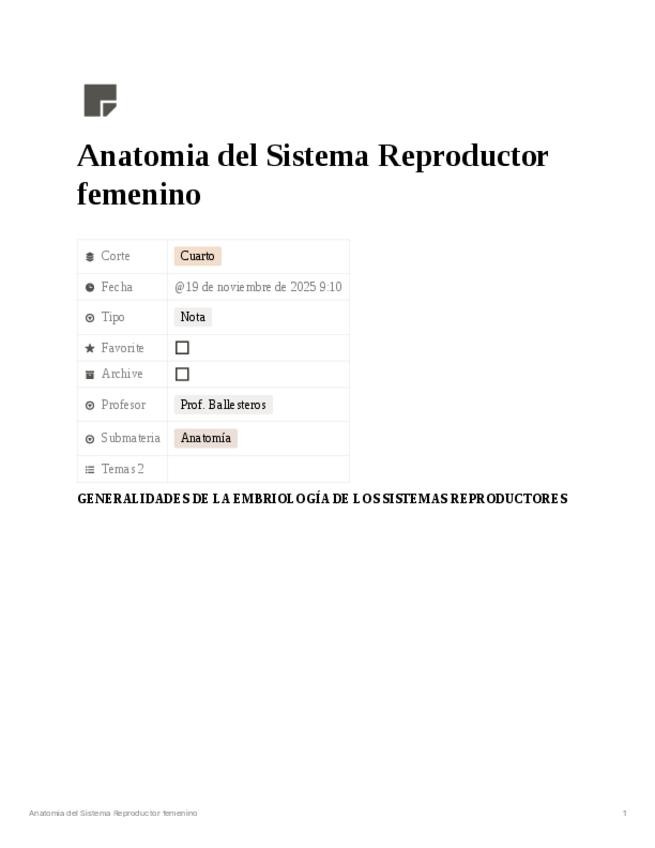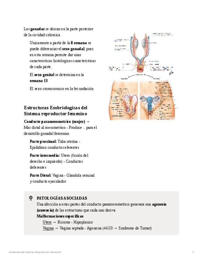 Apuntes detallados sobre la anatomía y embriología del sistema reproductor femenino. Incluye desarrollo embrionario (conducto paramesonéfrico), genitales externos, piso pélvico, clítoris, glándulas vestibulares, vagina, útero, trompas uterinas y ovarios.