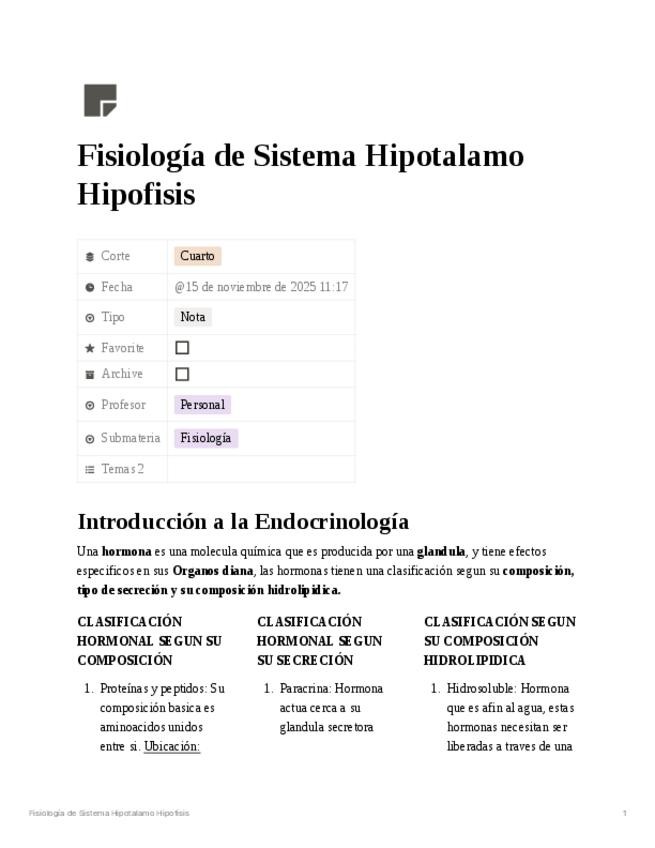 Apuntes completos de fisiología del sistema hipotálamo-hipofisiario. Incluye introducción a la endocrinología, clasificación hormonal, mecanismos de retroalimentación positiva y negativa, vías de conexión hipotálamo-hipófisis y organización de la adenohip