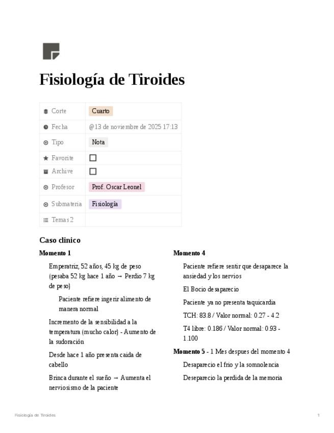 Apuntes detallados de fisiología de la glándula tiroides que abarcan la síntesis de las hormonas tiroideas (T3 y T4), regulación por el eje hipotálamo-hipófisis-tiroides, mecanismos de acción, metabolismo y factores que estimulan o inhiben su producción.