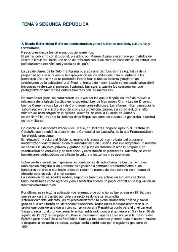 TEMA 9/9.2 Bienio Reformista: Reformas estructurales y realizaciones sociales, culturales y territoriales. APUNTES DE 10
