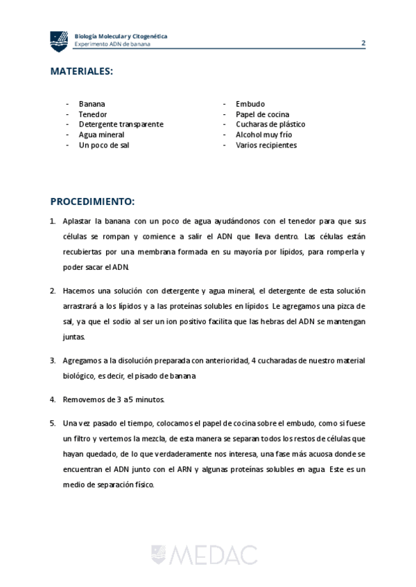 He publicado nuevos practicas de Biología molecular y citogenética: Protocolo extracción de ADN de una banana.pdf