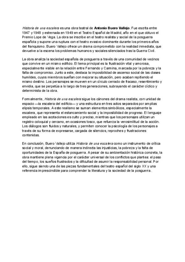 Valoración crítica obra posterior a 1936: Historia de una escalera de Buero Vallejo (1949).
