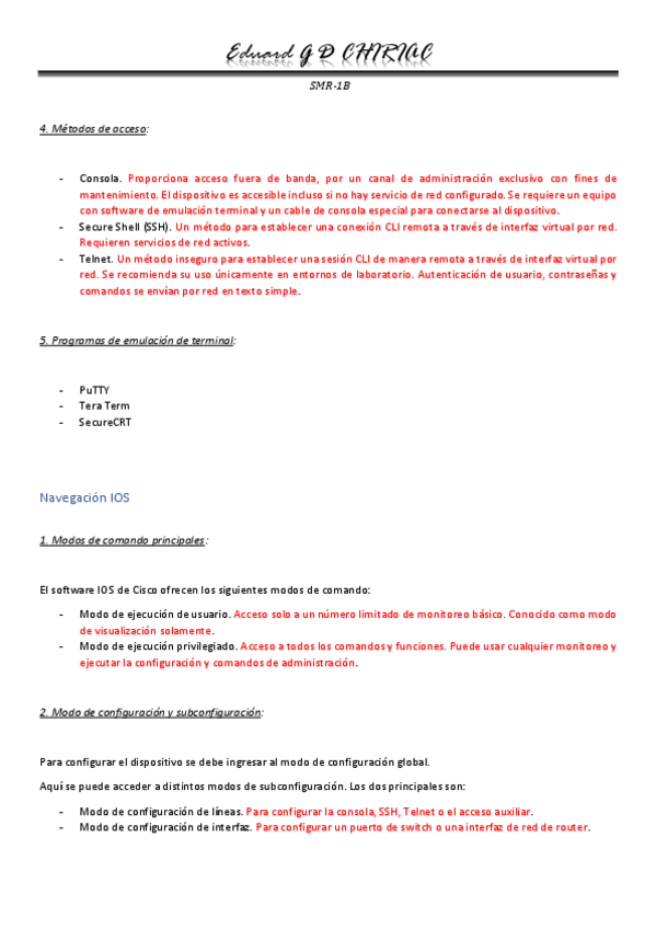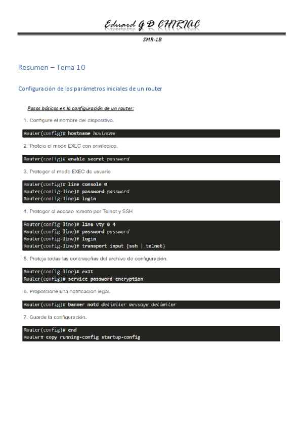 En este resumen se recogen los comandos, pasos y características que hay que tener en cuenta a la hora de configurar un switch (apilador) mediante el uso de terminales.