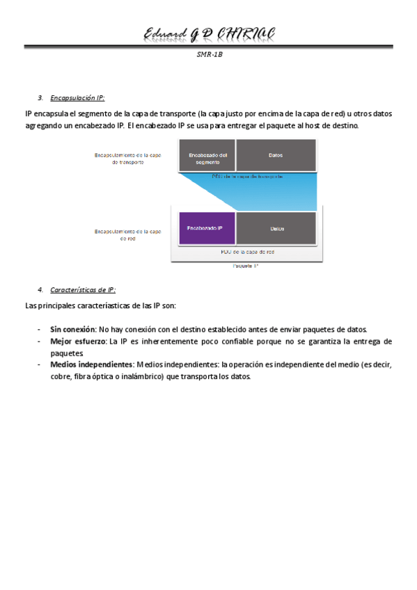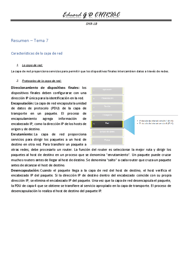 En este resumen se tratan las características de la capa de red, los paquetes IPv4 e IPv6, se verá como arma las rutas un host y las tablas de enrutamiento.