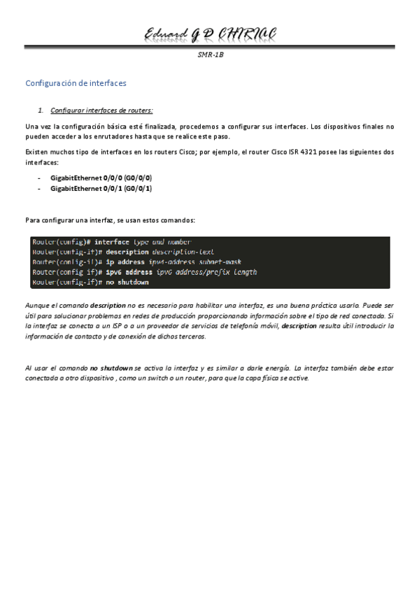 En este resumen se analizan los parámetros iniciales del router, la configuración de interfaces y la configuración del gateway predeterminado, pasos que se pueden utilizar para la configuración de un router físico.