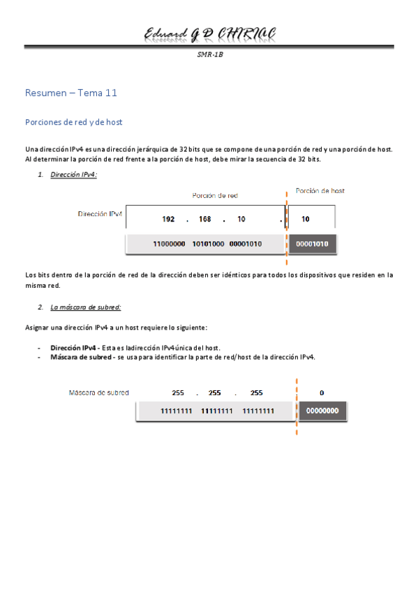 En este resumen se verán apartados acerca de las direcciones IPv4 como su estructura, los tipos, la segmentación y otras características.